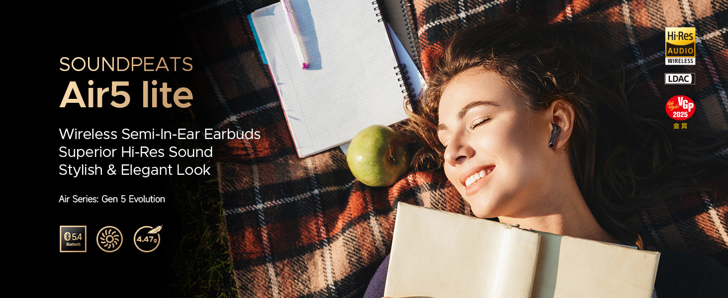 | What's in the Box | Soundpeats Air 5 Lite Earbuds, USB-C Charging Cable, User Manual, App Guide, Peats Sticker |