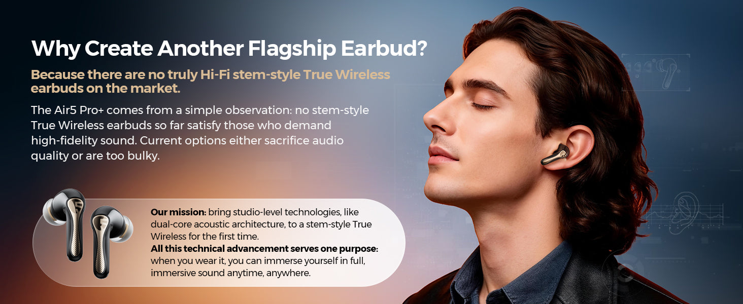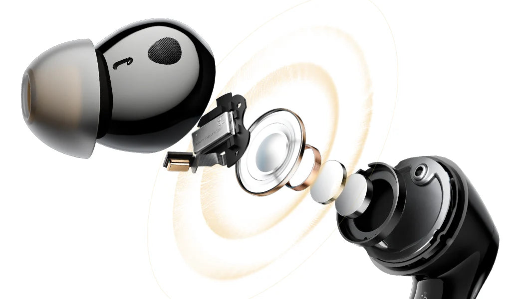 At the heart of Air5 Pro+ lies a hybrid driver system combining advanced MEMS (Micro Electro Mechanical Systems) and dynamic technologies. The MEMS driver delivers ultra-responsive, detailed mids and highs, while the dynamic driver brings powerful, resonant bass. Together, they create a sound that’s both precisely balanced and emotionally powerful — a vivid harmony of clarity, accuracy, and depth.