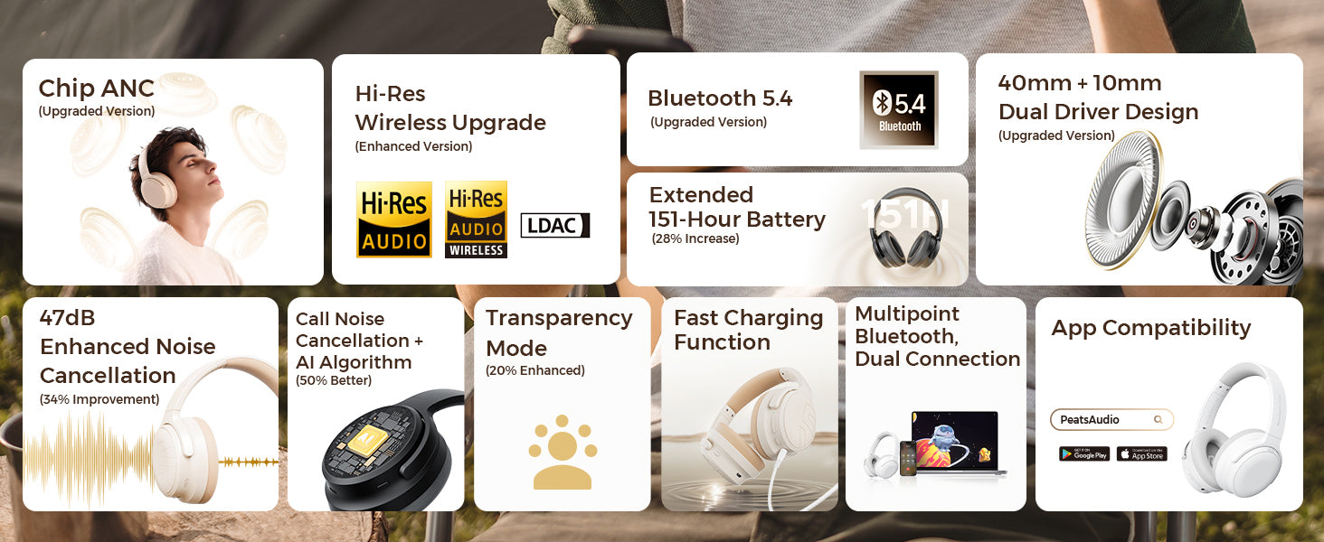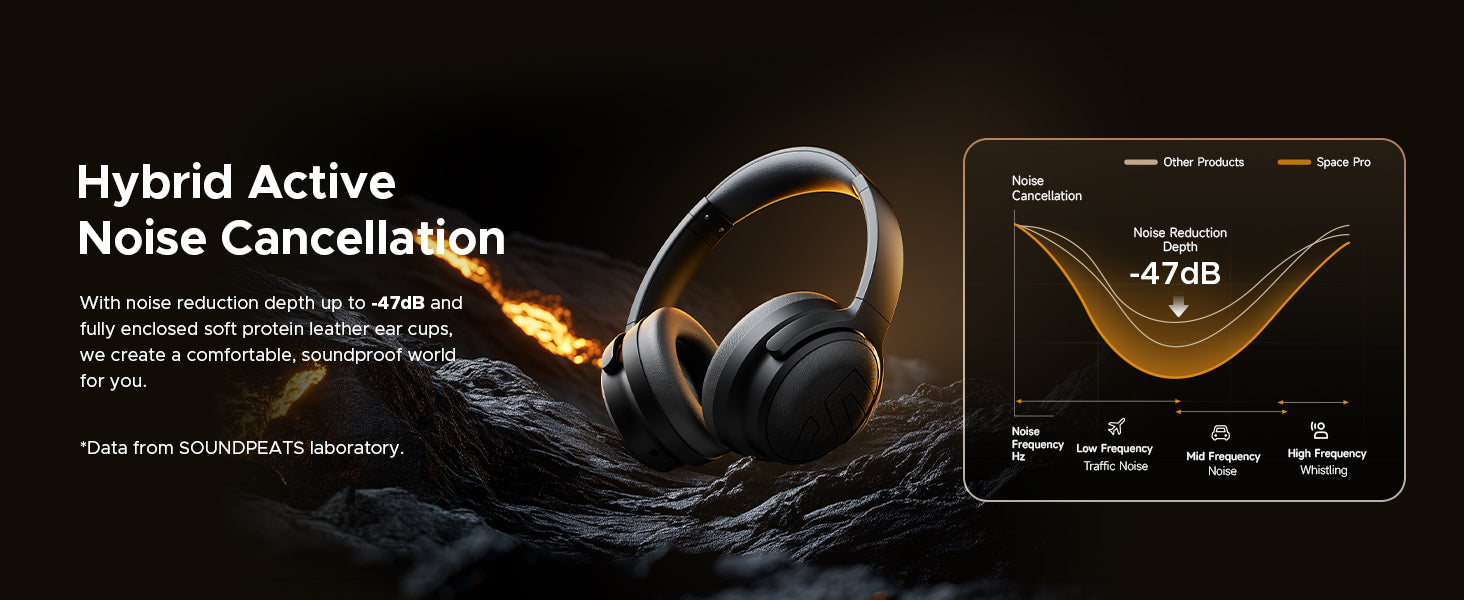 Premium noise cancelling powered by adaptive SOUNDPEATS Space Pro active noise cancelling. Advanced Hybrid ANC & Transparency Mode – Hybrid active noise cancellation up to -47dB combined with full-coverage earcups blocks outside distractions. Switch to Transparency Mode to hear your surroundings safely without removing your ANC headphones.